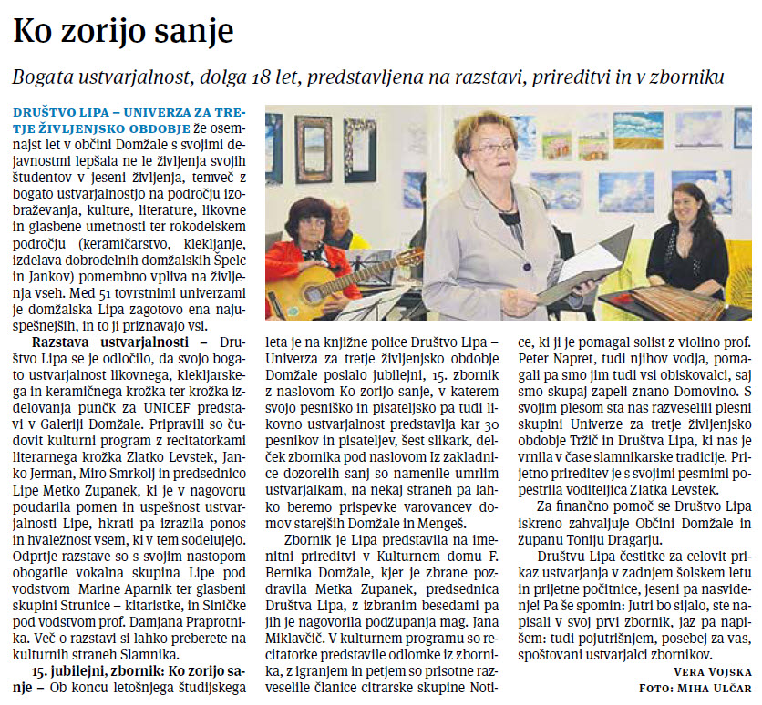 Slamnik 6/2016 pohvalno o naših dejavnostih Objavljeno 26 junij 2016 . Glasilo občine Domžale Slamnik 24. junija v številki 6/2016 objavlja dva prispevka o delu našega društva: < Nazaj Naprej >