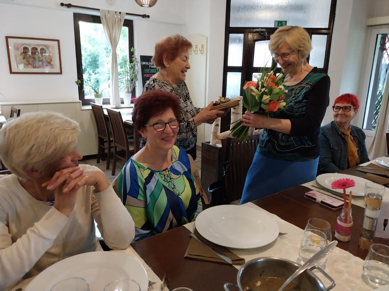 Letošnje leto smo delovale z novo mentorico Tejo Vrankar in se ukvarjale z zanimivimi temami in odgovori na vprašanja: Zakaj je v veljavi premoč desne roke nad levo? Kakšen je njun, tudi simbolni pomen? Kaj pomenijo krožna gibanja in kako so povezana z mejnimi prostori? Preslica, predenje, predice…nit pomeni tudi nit življenja, ki jo vodijo in nadzorujejo rojenice in sojenice…Kakšna je simbolika kruha? Ponekod še vedno za dobrodošlico ponudijo kruh s soljo ali pogačo (Bela Krajina), ki jo lomimo, ne režemo…Zeleni Jurij pa izhaja iz mita o ciklični obnovi sveta. Svetu je pri starih Slovencih vladal Perun, gromovnik, gorsko božanstvo…torej na vrhu osi tega sveta (axis mundi). Starim bogovom sledijo tudi drugi mitični junaki: Kresnik, riba Faronika, kralj Matjaž…Potem pa so v našem programu sledile bolj oprijemljive teme, npr. kako se je godilo ženskam v 19. stoletju – verjemite, ne preveč dobro, saj je bil velik del ženske biti zavit v tabuje in predsodke. Zanimali so nas tudi kmečki posli, obrti in zdravilstvo v tem času. Glede zdravja so takrat bolj zaupali zeliščaricam, konjedercem z »žavbami«, kakor pa ranocelnikom oziroma zdravnikom tistega časa. Glede na koledar pa smo zaznamovale tudi različne praznike, si s skromno pozornostjo voščile za rojstni dan. Ob koncu leta tako skupno kosilo ostaja tradicija in slavnost: pomembne so zahvale mentorici, animatorki in nasmejani obrazi izžarevajo veselje in dobro voljo. Sanda nas vedno znova razveseli z drobno pozornostjo, ki jo naredi sama: majhen žepek z gumbom z malimi ženskimi lepotili v njem… Majda vselej pove kaj lepega in citira kakšno pesem, tokrat Toneta Pavčka: