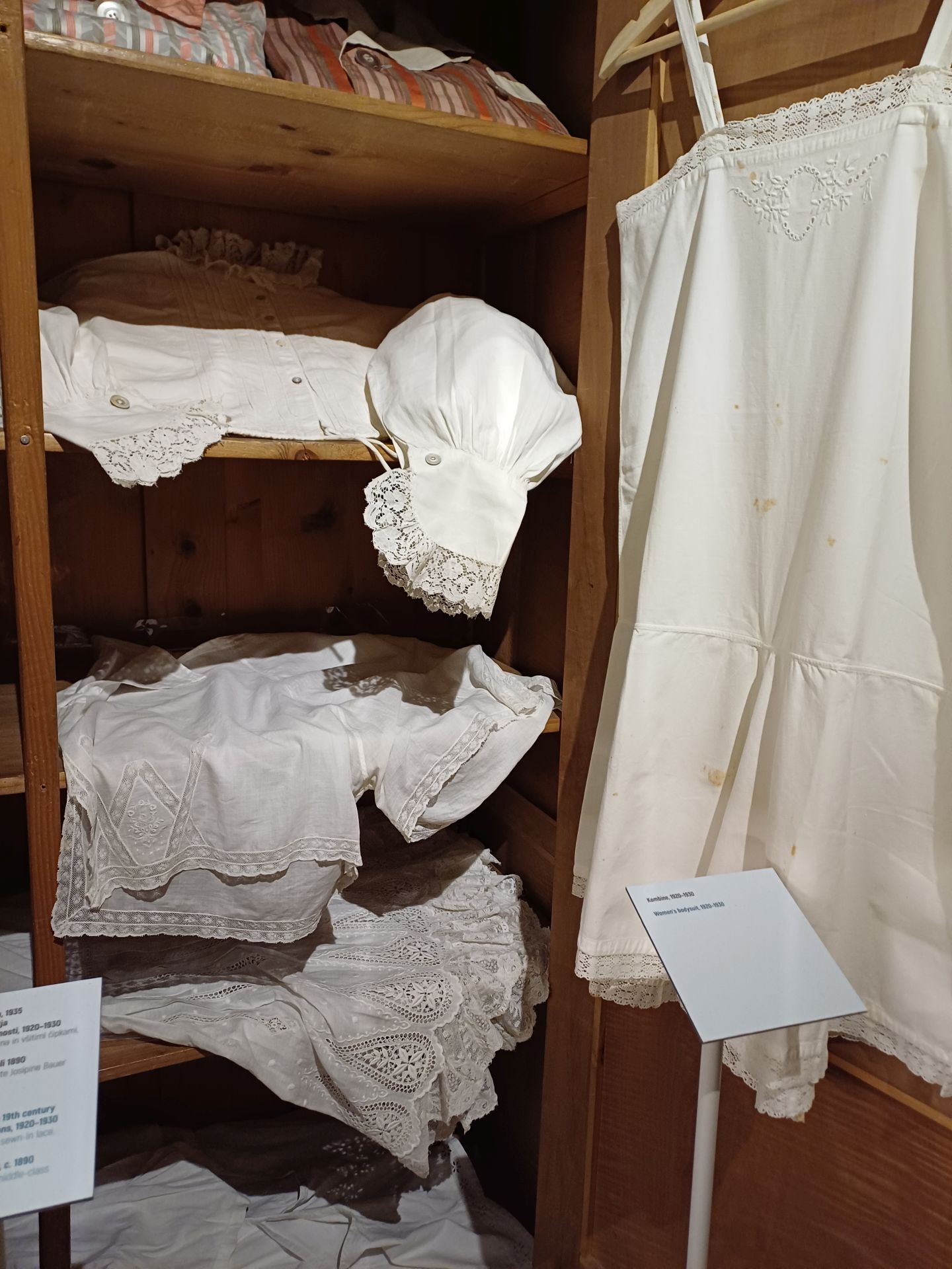 Prvi zbiralec in proučevalec je bil Angelos Baš, etnolog in zgodovinar. Raziskoval je oblačilno kulturo vseh socialnih slojev od 16. do 19. stoletja. Prav zato so na začetku razstave tudi kopije fresk, na primer z nam bližnjega Sv. Primoža nad Kamnikom, ki predstavljajo tkalko v lepi obleki. V preteklosti, smo izvedele, so bila oblačila strogo določena glede na socialni sloj in glede na priložnost, ko so jih nosili_e. Kmetje niso smeli imeti svilenih oblek, tudi barvanih ne. Krojači so bili lahko samo moški, edino oblikovalke klobukov, modistke, so bile ženske. Šele s strojnim tkanjem in šivanjem so v tekstilno industrijo vstopile tudi ženske. Zanje je bil to po eni strani zaslužek, po drugi pa pot v kronične bolečine in poklicno invalidnost. V muzejskih prostorih so eksponati razdeljeni po zanimivih naslovih, eden izmed njih je Od krsta do krste. V vitrinah najdemo tako imenovane »pindekelčke«, ki smo se jih spomnile še iz petdesetih let prejšnjega stoletja. V njih so zavijali dojenčke, ko so jih nesli h krstu, pa tudi k zdravniku.