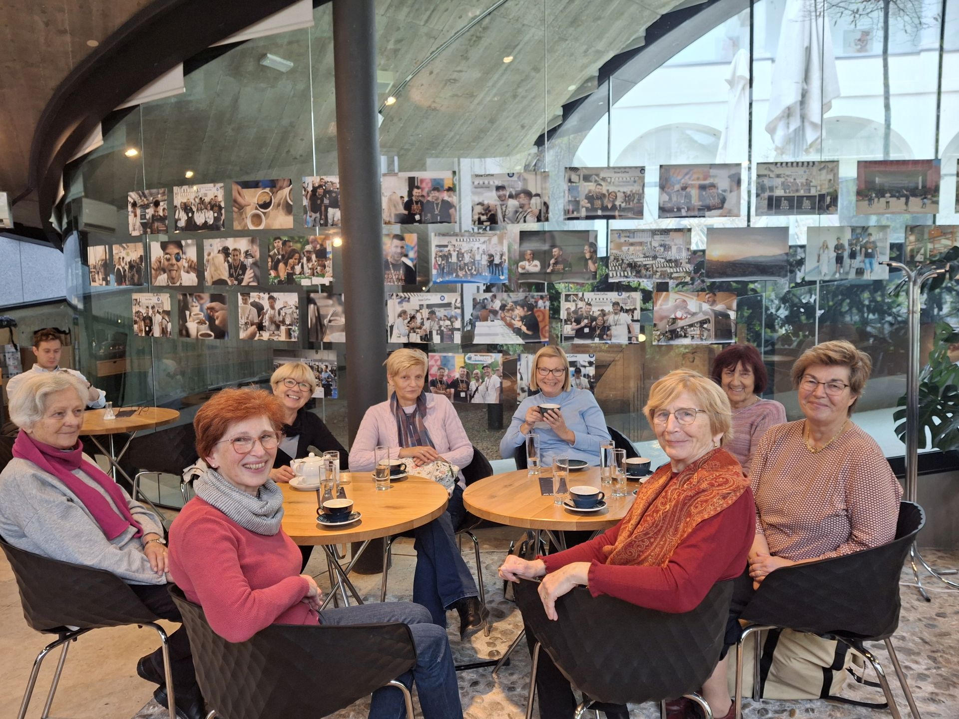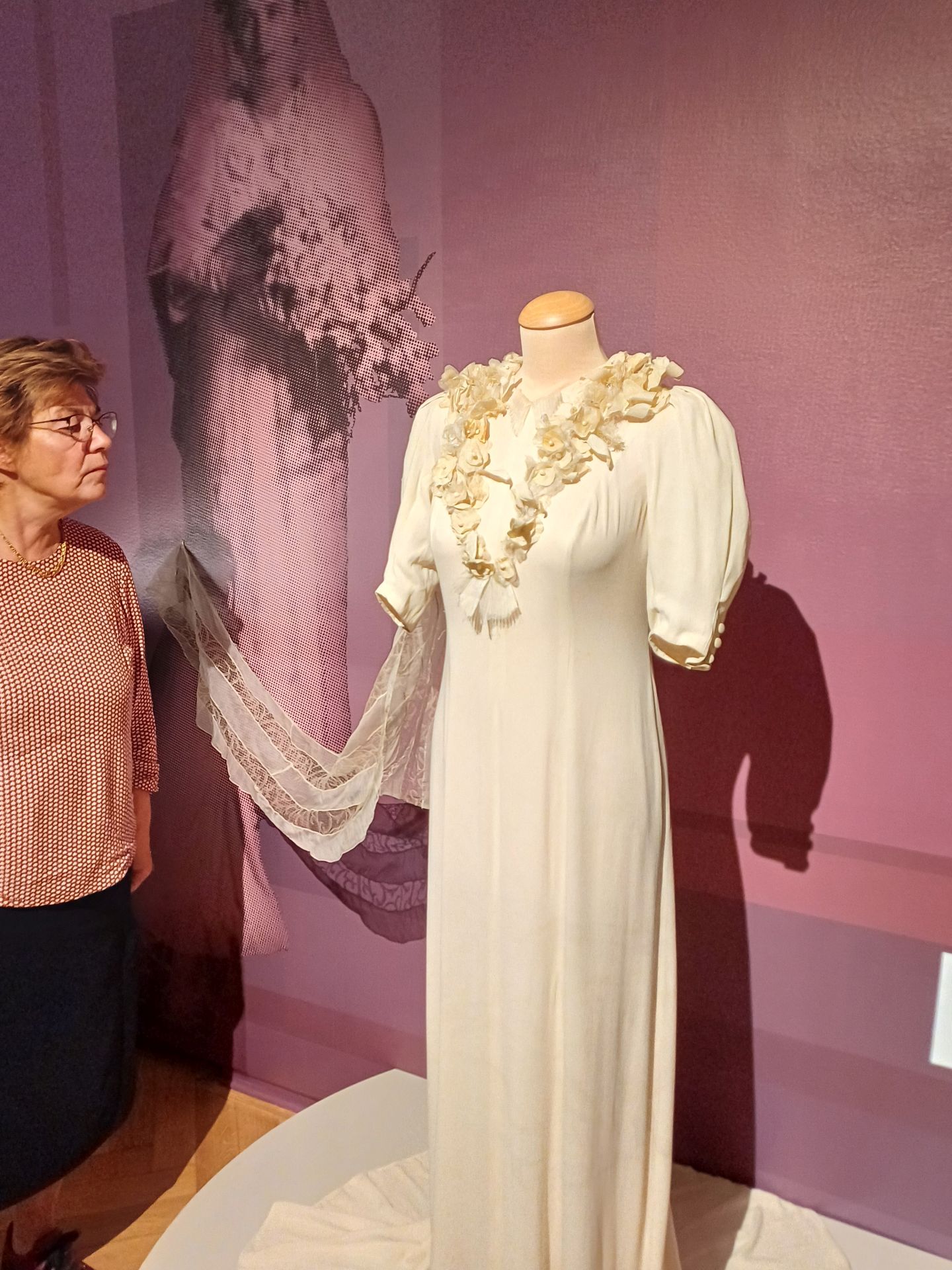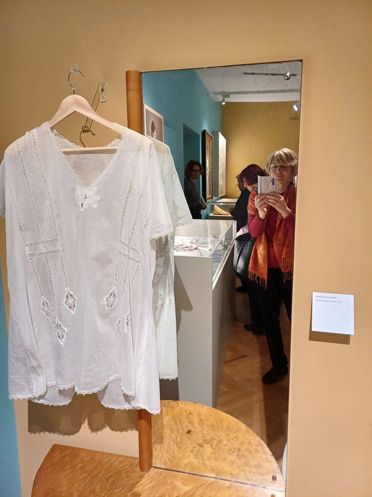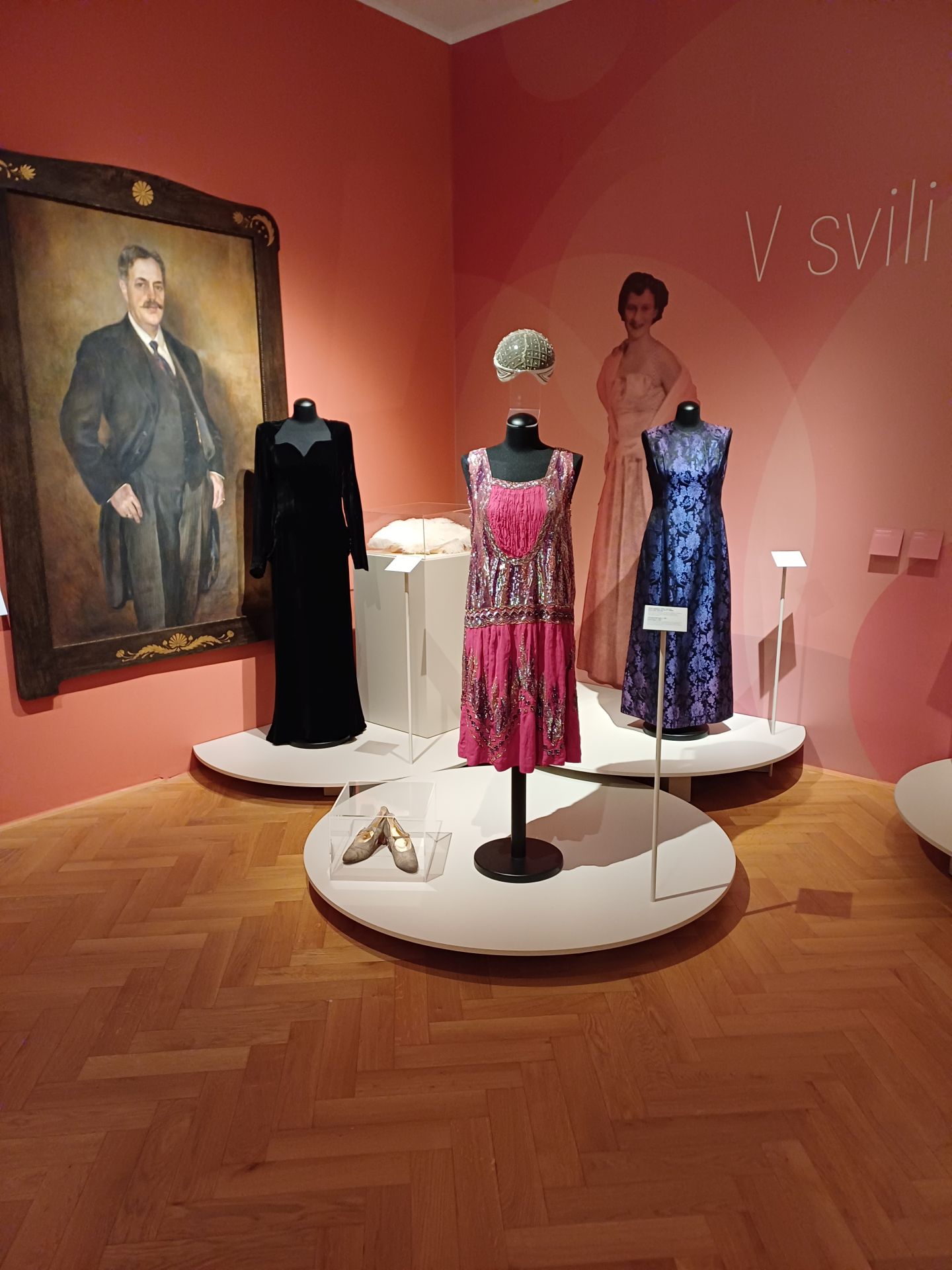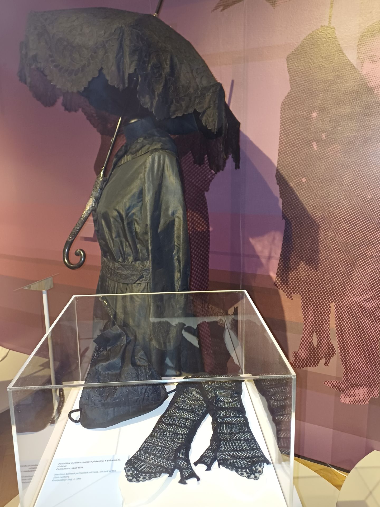 Letos se pri etnologiji pogovarjamo o identiteti, zato smo zastrigle z ušesi, ko smo izvedele, da je bil torej žaket identitetno oblačilo meščanov – Slovencev. O identiteti lahko govorimo tudi ob razstavljeni poročni obleki Vande Vaclaviček, ki se je poročila z znamenitim akademikom, elektroinženirjem, izumiteljem in šahistom - velemojstrom dr. Milanom Vidmarjem. Iz njenega dekliškega priimka o njej lahko sklepamo, da je bila češkega rodu…V sobi z naslovom Od svile do baržuna (madžarsko barsony), to je žameta, so razstavljene same plesne obleke, ki so iz dragocenih materialov. Take bi danes težko kupili, saj sodobne tkanine mešajo z umetnimi vlakni. Plesna obleka je postala krajša, ko so začeli plesati v Ameriki v času prohibicije čarlston. Na razstavi je sicer malo moški oblačil, nekaj je perila pa tudi Plečnikova kapa, ki jo je nosil doma tudi podnevi, saj je veliko kadil in ni hotel, da bi njegovi lasje imeli vonj po tobačnem dimu. Zadnji del razstave je namenjen krznenim oblačilom novejšega datuma, nekaterim izdelkom znanih slovenskih znamk – žal, zapravljenih zaradi tajkunov - kot so bile Rašica, Pletenina…Znameniti parazol pa je po Ljubljani nosila pesnica Lili Novy. Naše oglede smo seveda zaključile kot vedno s kavico v muzejski kavarni. Priporočamo ogled!