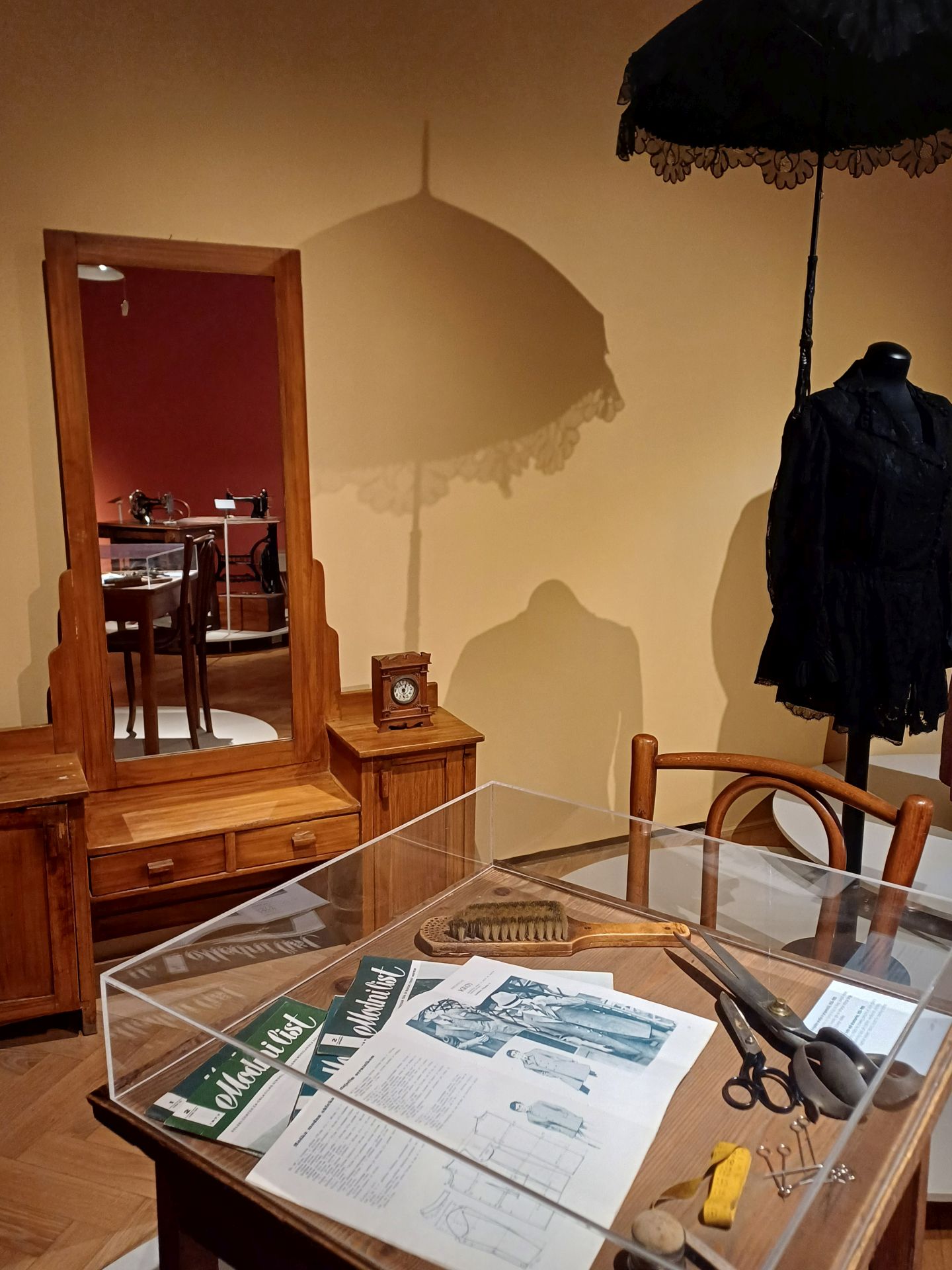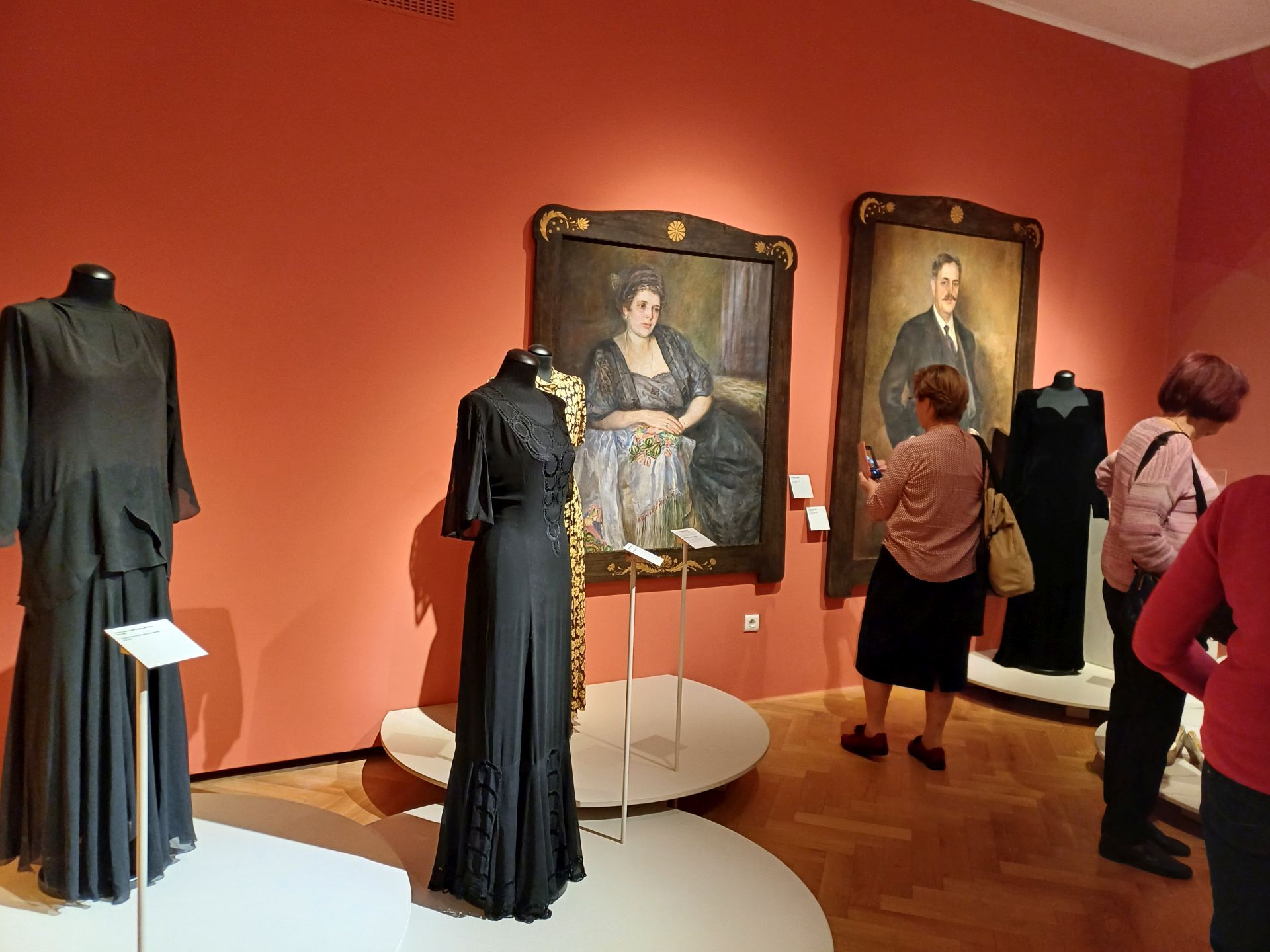 V sobah je nekaj poročnih oblek, tudi temno modre barve. V prejšnjih časih za poroko ni bilo v navadi nositi belih oblek. Ali ste vedeli, da je belo poročno obleko kot prva imela bodoča angleška kraljica Viktorija, ko se je poročila s princem Albertom? Postala je tudi prva modna ikona tistega časa. Tem oblekam nasproti so razstavljene kasnejše poročne obleke iz druge polovice 20. stoletja, ko je bilo za to slovesno priložnost spet moderno nositi še druge barve. Žalovanje je bilo povezano s strogo črnino, črno čipko, rokavicami in klobukom. Šele po pol leta žalovanja je ženska smela obleči črno obleko z diskretnim svetlejšim vzorcem. Razložili so nam tudi, kaj je bil korzet (francosko corset), torej steznik, ki so ga zategovali z vrvicami in tako lepšali postavo, hkrati pa jemali sapo, da so dame omedlevale…Razstavljen je pod Sternenovo oljno sliko z enakim naslovom. Žaket (francosko jaquette) pa je daljši moški suknjič, malce podoben fraku, vendar zadaj drugače krojen in z drugačnim izrezom na hrbtu. Slovenski meščani, ki so si ga seveda lahko privoščili, so pripisovali frak in cilinder nemškim meščanom in jih tako prikazovali tudi na karikaturah. Tako so v nasprotju z njimi hoteli nositi žakete.