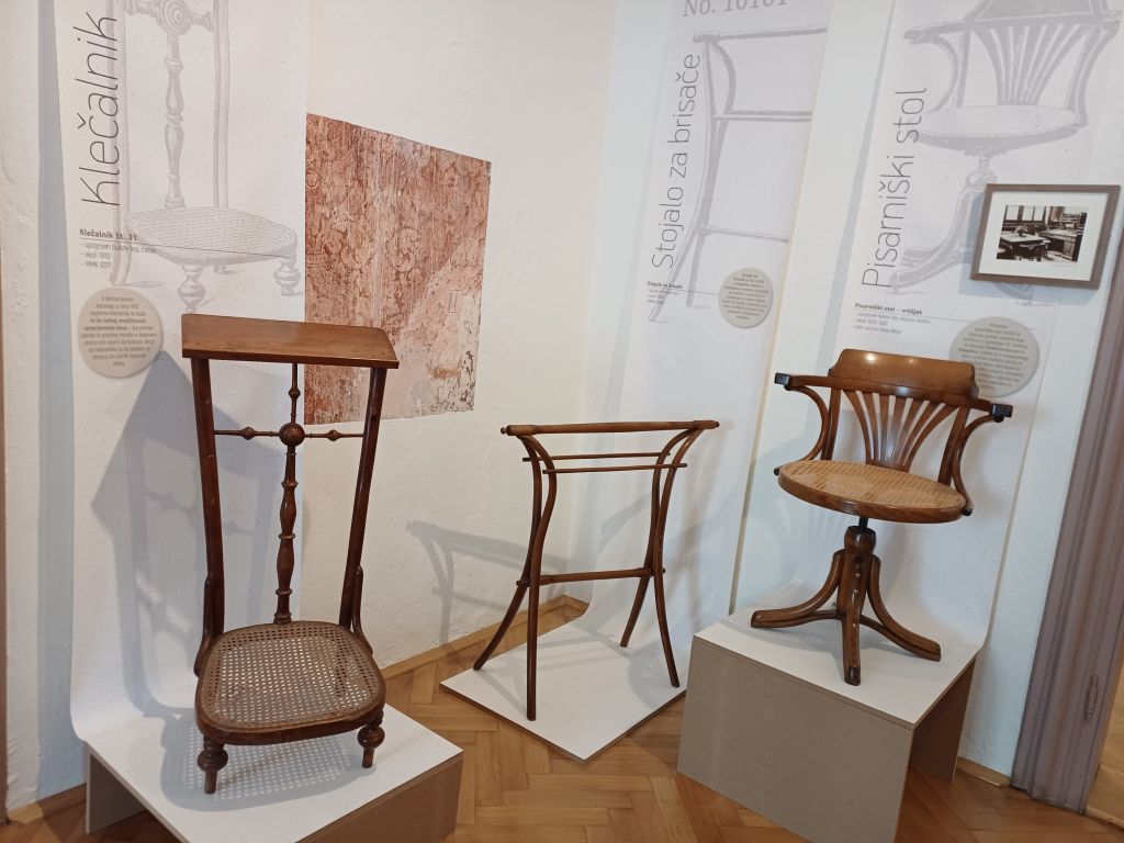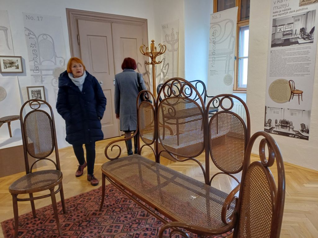 Druga razstava, ki smo si jo ogledali, ima naslov Čar in lepota upognjenega lesa od Thoneta do danes. Gre za izum upogibanja masivnega lesa s pomočjo pare in železnih kalupov. Michael Thonet je leta 1856 svetu predstavil tehniko, ki je vse do danes v bistvu ostala nespremenjena. Nastali so čudoviti in cenovno dostopni izdelki – stoli, mizice, klopi, španske stene, držala za brisače in otroško pohištvo, ki so jih dolgo izdelovali tudi na Duplici. Zagotovo bi se še dlje zadrževali in si ogledovali izdelke obrtniško – tehniške dediščine, a grad je pozimi res mrzel…