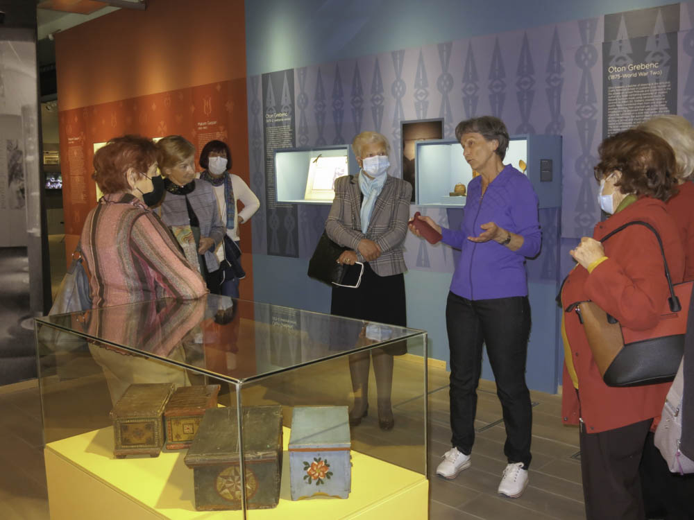 Slušateljice etnologije se nismo »ustrašile« izziva sporočilnosti in razmisleka obeh predstavljenih sklopov in smo si z veseljem ogledale razstavo, ki jo je za nas, kakor mnoge prejšnje, spet vodila gospa Vilma Kavšek. Žal nas je bilo na ogledu le šest, saj so druge sošolke, žal, spet preganjale svoje zdravstvene težave.
