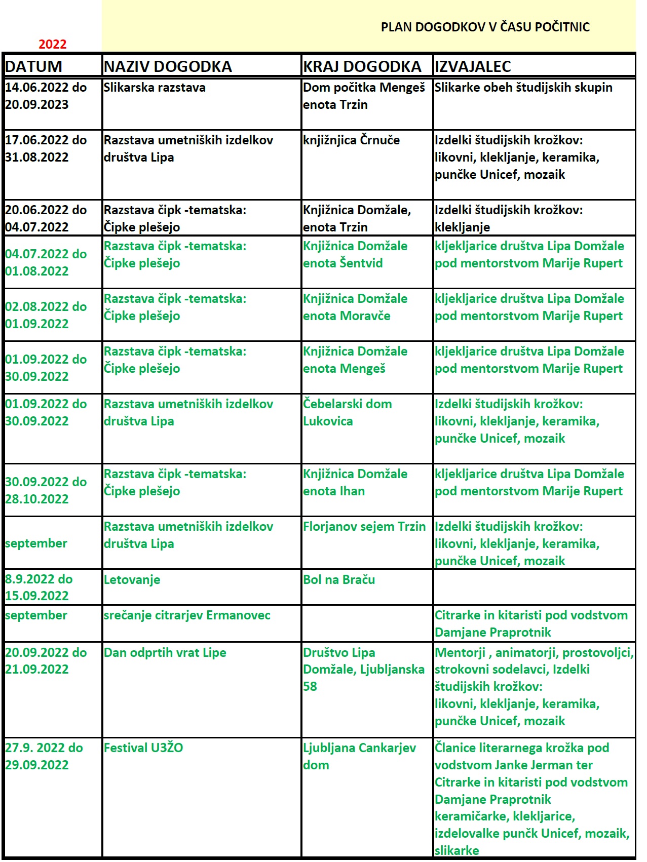 Plan dogodkov v času počitnic Objavljeno 05 julij 2022 . Legenda: zeleno - plan črno - v teku < Nazaj Naprej >