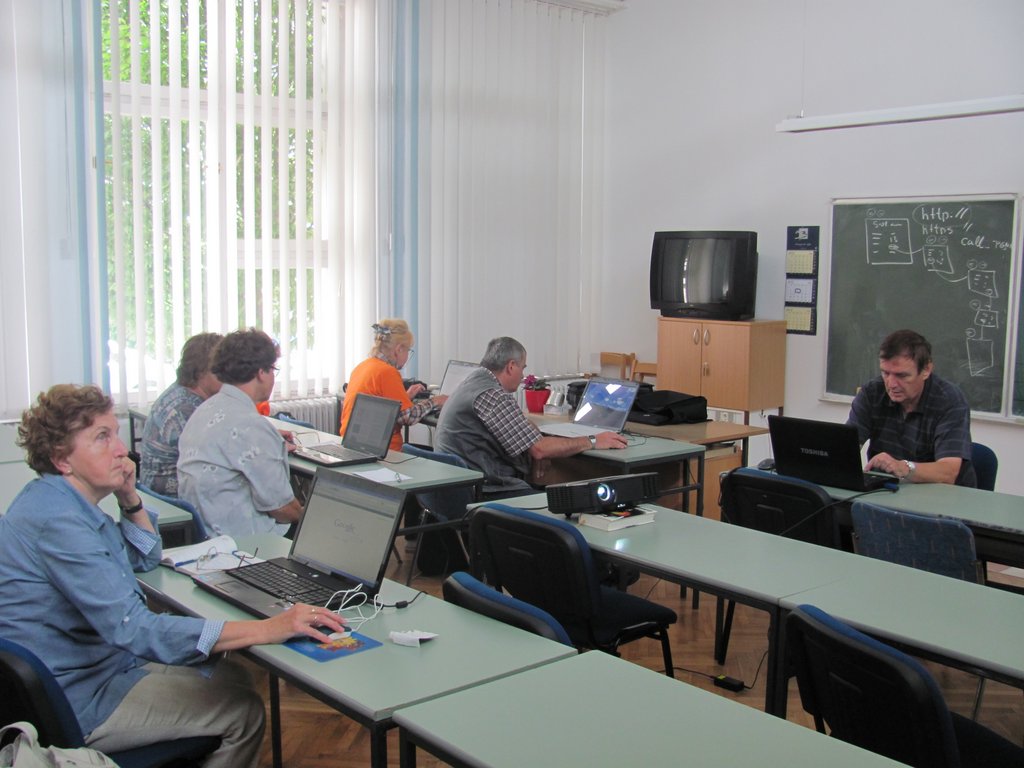 Iz Lipe so se prijavili mentorji Vinko Kurzweil, Marija Rupert in Mojca Korošec, novost pa je letos šest dijakov iz Gimnazije Domžale, ki so prispevali svoje znanje za poučevanje starejšie generacije. Po kratkem uvodu, so se formirale skupine: čisti začetniki, ki jih je prevzel Vinko in dvojice z Marijo in Mojco ter s simpatičnimi mladimi gimnazijci. Slušatelji, ki so imeli že nekaj predznanja, so svojim mentorjem povedali, kaj jim še dela težave pri uporabi računalnika in še kakšno specialnost /ureditev fotografij, delo v wordu .../, ki bi jo želeli spoznati. Teh predvidenih deset ur je tako hitro minilo, da nisem uspela niti fotografirati dela v parih z gimnazijci v predvidenih dneh do četrtka, le v petek mi je še uspelo ujeti pri delu Vinka Kurzweila s skupino začetnikov in Mojco Korošec s svojo učenko, gospo Tanjo Lajovic.