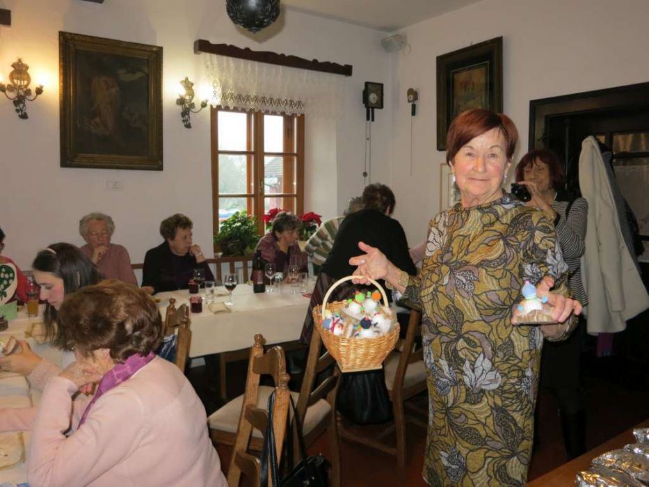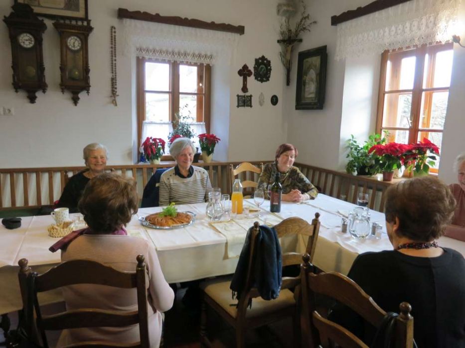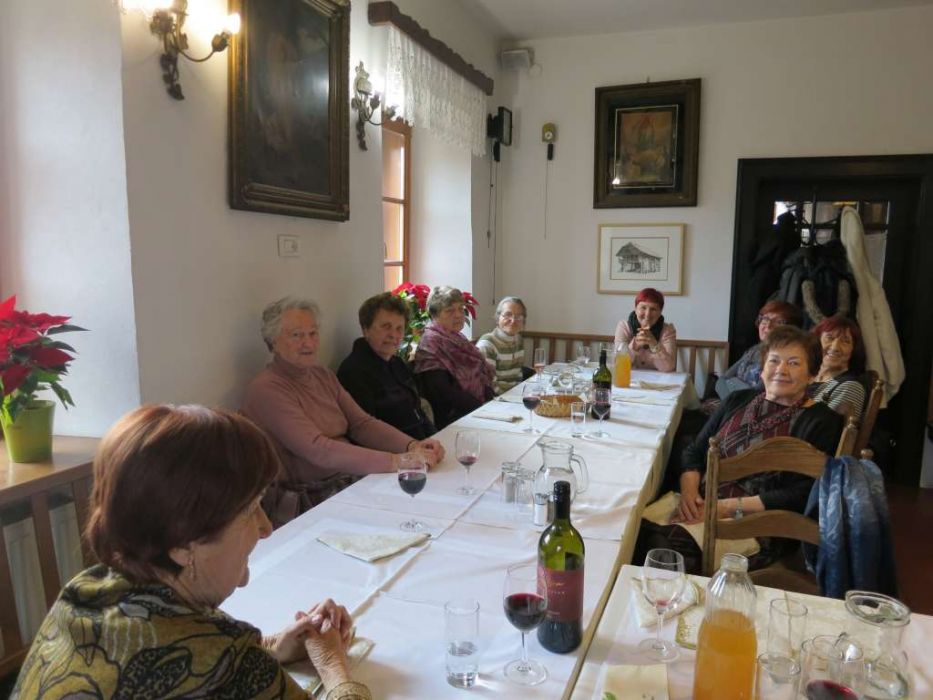 Nadaljevale pa smo s kosilom Pr' Krač, kjer je cela domačija vzor zbiranja in varovanja dediščine. Po domačem in okusno pripravljenem kosilu pa smo zapele nekaj ljudskih pesmi in si razdelile še drobna darila: Andreja nas je obdarovala z doma pripravljeno marmelado, Sanda je ročno izdelala snežene može z voščili, Manica je pripravila fotografije dozdajšnjih naših aktivnosti. Na koncu ni manjkalo ubesedenih voščil in s tem zapisom jih za ltople praznične dni in srečno novo leto predajam tudi vsem vam. Tole je zapisala Sanda: