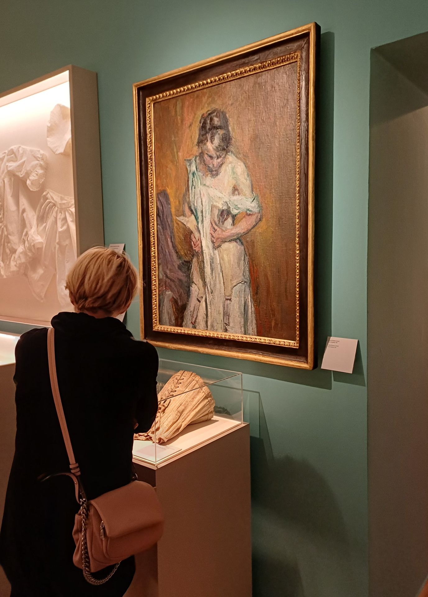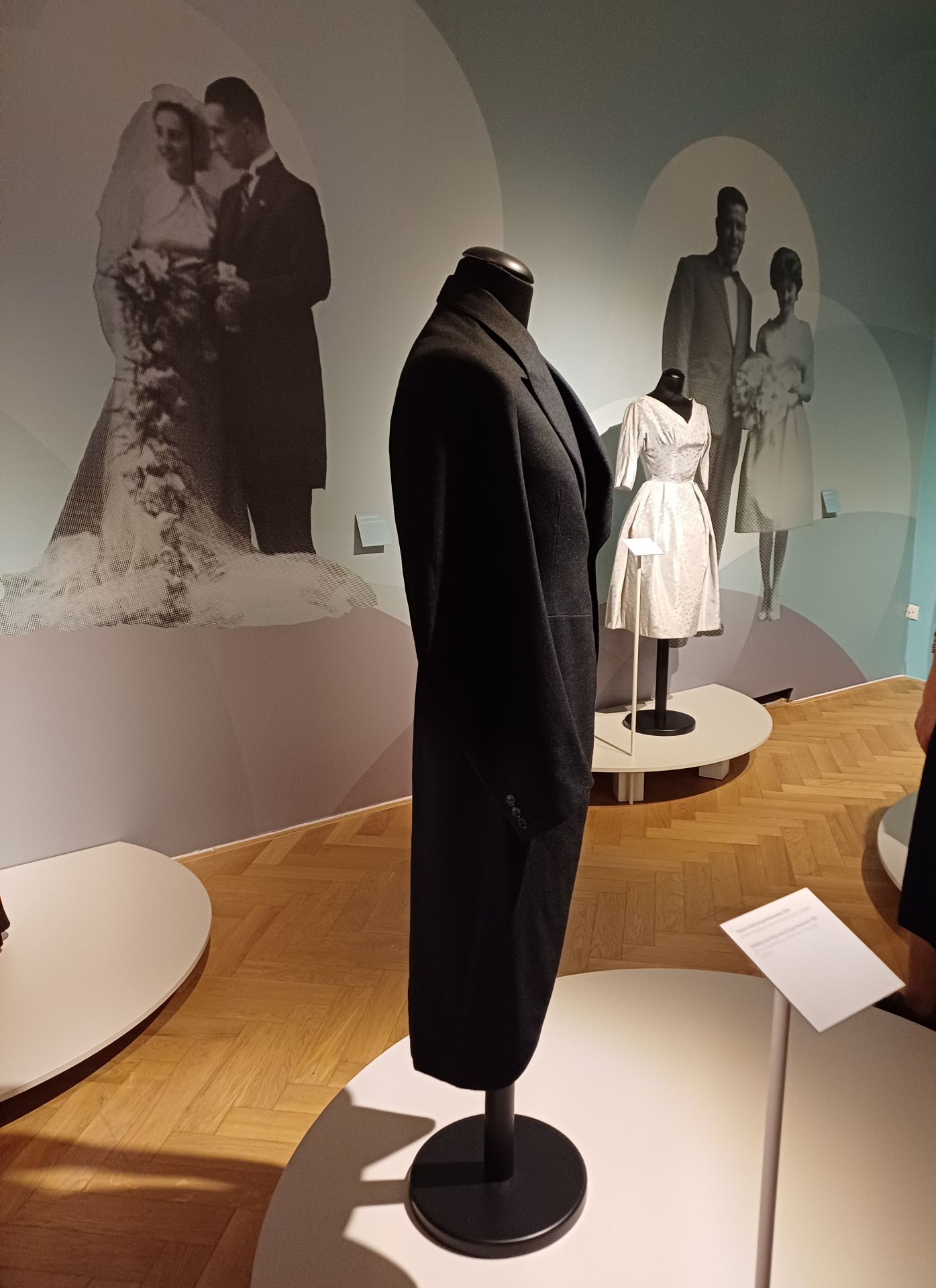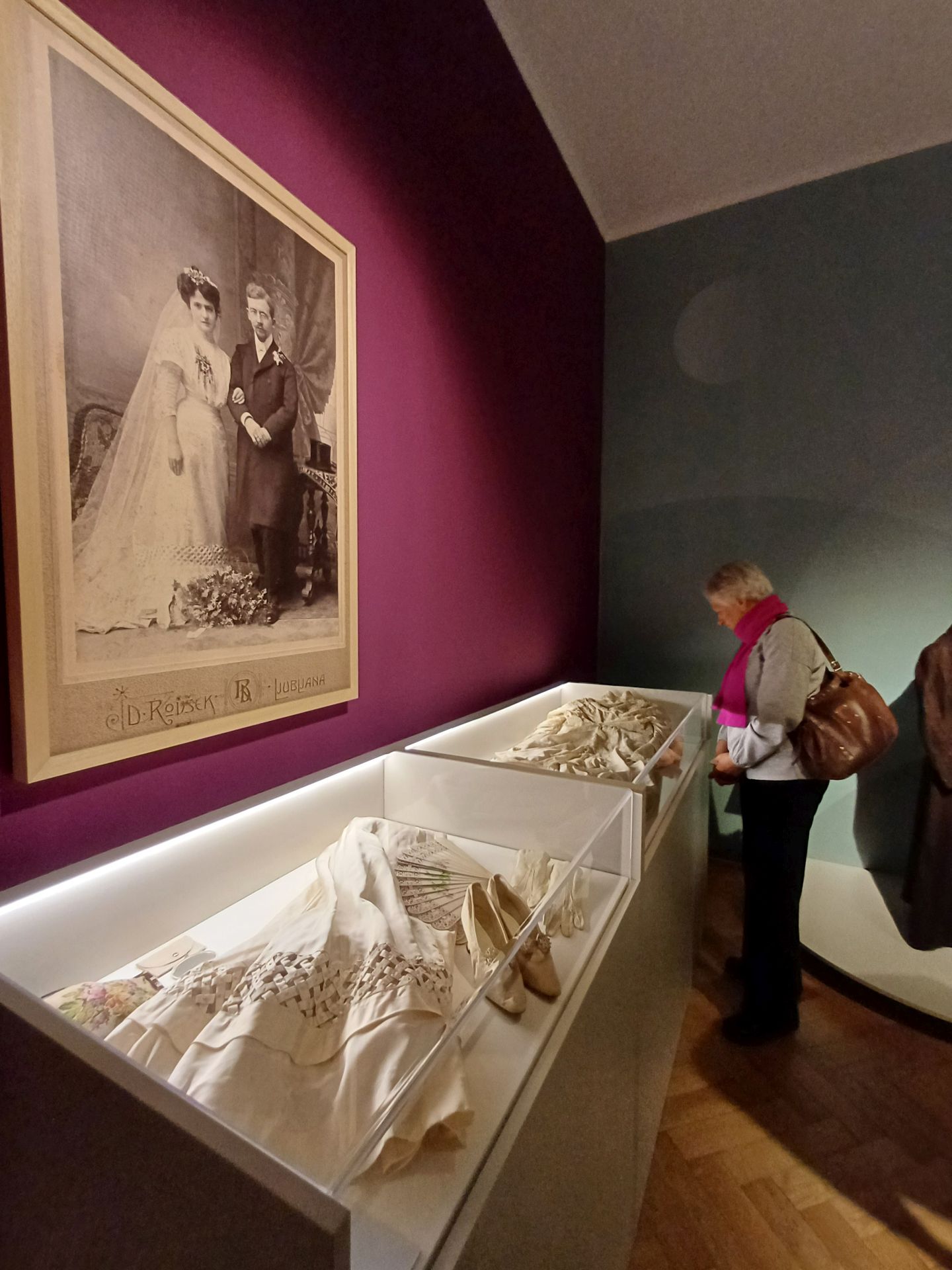 V sobah je nekaj poročnih oblek, tudi temno modre barve. V prejšnjih časih za poroko ni bilo v navadi nositi belih oblek. Ali ste vedeli, da je belo poročno obleko kot prva imela bodoča angleška kraljica Viktorija, ko se je poročila s princem Albertom? Postala je tudi prva modna ikona tistega časa. Tem oblekam nasproti so razstavljene kasnejše poročne obleke iz druge polovice 20. stoletja, ko je bilo za to slovesno priložnost spet moderno nositi še druge barve. Žalovanje je bilo povezano s strogo črnino, črno čipko, rokavicami in klobukom. Šele po pol leta žalovanja je ženska smela obleči črno obleko z diskretnim svetlejšim vzorcem. Razložili so nam tudi, kaj je bil korzet (francosko corset), torej steznik, ki so ga zategovali z vrvicami in tako lepšali postavo, hkrati pa jemali sapo, da so dame omedlevale…Razstavljen je pod Sternenovo oljno sliko z enakim naslovom. Žaket (francosko jaquette) pa je daljši moški suknjič, malce podoben fraku, vendar zadaj drugače krojen in z drugačnim izrezom na hrbtu. Slovenski meščani, ki so si ga seveda lahko privoščili, so pripisovali frak in cilinder nemškim meščanom in jih tako prikazovali tudi na karikaturah. Tako so v nasprotju z njimi hoteli nositi žakete.