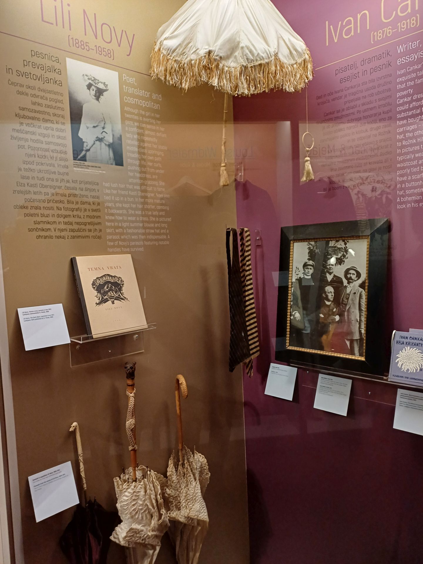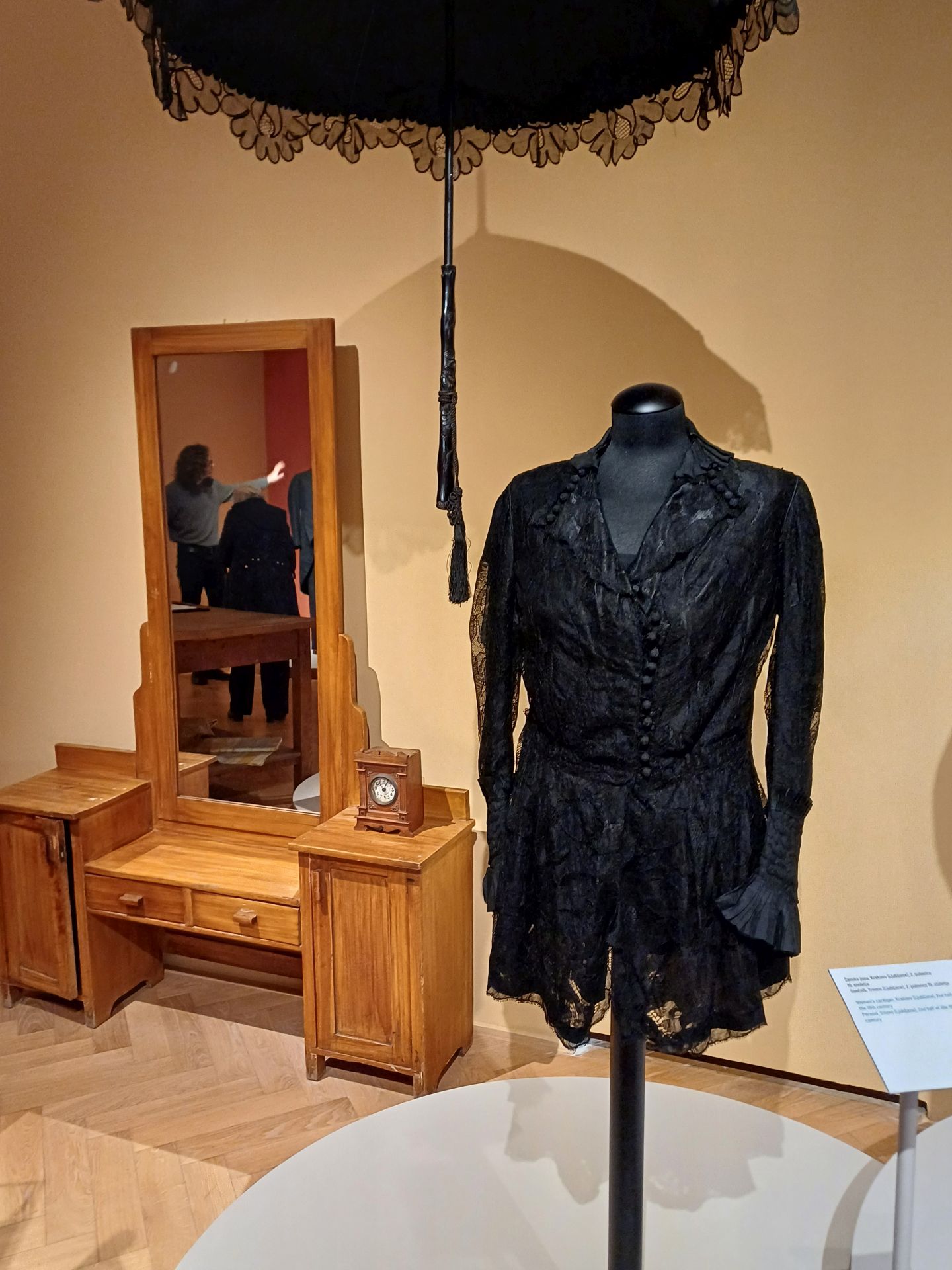 Letos se pri etnologiji pogovarjamo o identiteti, zato smo zastrigle z ušesi, ko smo izvedele, da je bil torej žaket identitetno oblačilo meščanov – Slovencev. O identiteti lahko govorimo tudi ob razstavljeni poročni obleki Vande Vaclaviček, ki se je poročila z znamenitim akademikom, elektroinženirjem, izumiteljem in šahistom - velemojstrom dr. Milanom Vidmarjem. Iz njenega dekliškega priimka o njej lahko sklepamo, da je bila češkega rodu…V sobi z naslovom Od svile do baržuna (madžarsko barsony), to je žameta, so razstavljene same plesne obleke, ki so iz dragocenih materialov. Take bi danes težko kupili, saj sodobne tkanine mešajo z umetnimi vlakni. Plesna obleka je postala krajša, ko so začeli plesati v Ameriki v času prohibicije čarlston. Na razstavi je sicer malo moški oblačil, nekaj je perila pa tudi Plečnikova kapa, ki jo je nosil doma tudi podnevi, saj je veliko kadil in ni hotel, da bi njegovi lasje imeli vonj po tobačnem dimu. Zadnji del razstave je namenjen krznenim oblačilom novejšega datuma, nekaterim izdelkom znanih slovenskih znamk – žal, zapravljenih zaradi tajkunov - kot so bile Rašica, Pletenina…Znameniti parazol pa je po Ljubljani nosila pesnica Lili Novy. Naše oglede smo seveda zaključile kot vedno s kavico v muzejski kavarni. Priporočamo ogled!