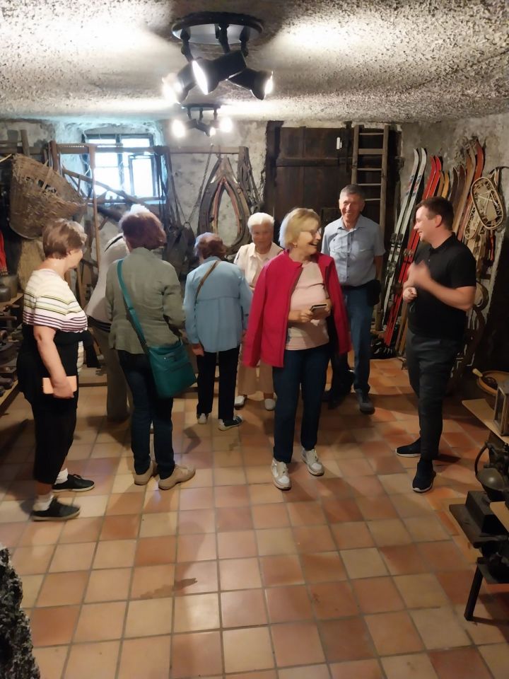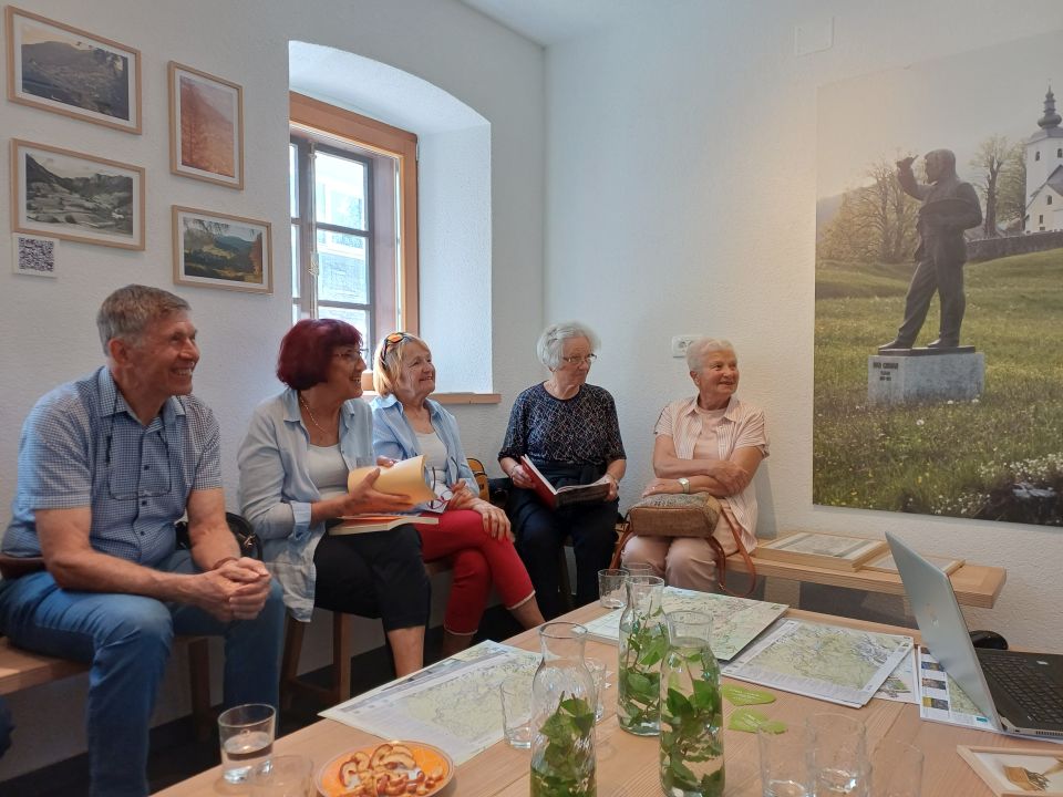 Ko smo se vsi zbrali, nas je pozdravil prijazen vodič Miha in nas popeljal najprej v Štobo (nem. Stube, slov. hiša, osredni prostor doma). Bili smo prva skupina, odkar so obnovili in uredili ta prostor z evropskimi in sredstvi Ministrstva za kulturo. Če povzamemo nekaj, kar smo slišali: Najprej so se naselili v teh hribovskih krajih Slovani, o čemer pričajo nekatera ledinska imena. V srednjem veku pa so bila ta slikovita pobočja med predalpskim svetom pod fevdalno oblastjo freisinških škofov, ki so prvih osem kmetov iz Innichena v Pustriški dolini na Tirolskem naselile leta 1283. Tam se kmetije pod obronki Dolomitov niso mogle več širiti. Prvi naseljenci so krčili gozd, kasneje so se jim pridružile njihove družine. Skoraj do danes se je med ljudmi ohranilo staro protonemško narečje, ki se kaže v ledinskih in hišnih imenih (vas Torka, priimek Torkar). Leta 2023 je bilo vpisano v register nesnovne kulturne dediščine. Miha nam je predvajal tudi govor Klare Marije Kejžar (nem. Käse – sir, s sirom so plačevali dajatve zemljiškemu gospodu), posnetem z fonogramom na vosku v začetku 20. stoletja, ko so ta govor že začeli preučevati. Miha je povedal nekaj stavkov in jih primerjal z današnjo nemščino in prevodom v slovenščino. V starih virih je narečni govor imenovan kot »Zarzariche sprache« (Soriško narečje). Med domačini pa je danes poznan kot »dajnarska špraha« oziroma pravijo, da gredo »drfaš merlat« (dajnarsko govorit, po vasi Dajne). Najnovejši projekt predvideva, odobren 2025, da bodo v Sorici skrbeli za ohranjanje te nesnovne, govorne dediščine. Prav tako pa prebivalci Sorice še danes, kot v preteklosti, gojijo prijateljske vezi z Innichenom in tako kot pred skoraj osemsto leti, še vedno nosijo v dar svečo v romarsko cerkev.