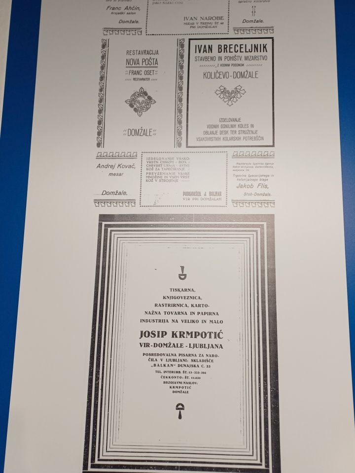 Pozorno smo pogledali slikovni material. Lepo je bilo uzreti oglas deda Ivana Breceljnika, mizarja iz Mlinske ulice 4, ki je imel delavnico stavbnega pohištva na Količevem.