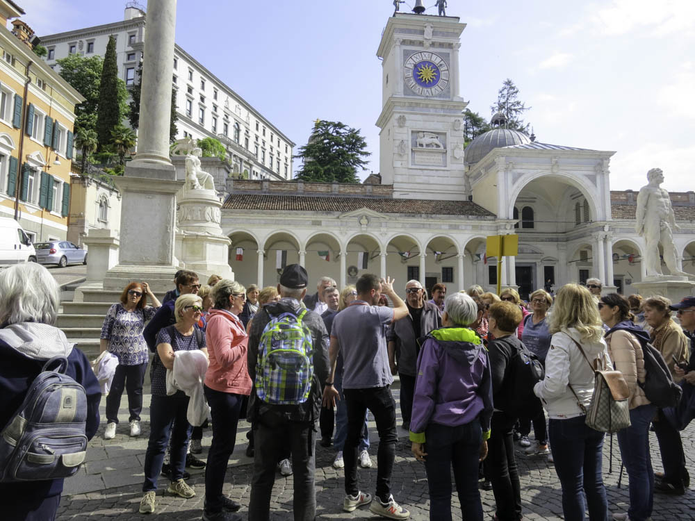 Najprej smo se ustavili v zeleni furlanski prestolnici Vidmu in si privoščili dobro kavo. Videm (furlansko Udin, italijansko Udine) je že od rimske dobe pomembno prometno, gospodarsko in kulturno središče, v srednjem veku je bil sedež oglejskega patriarhata, od 15. stol. do Napoleonove zasedbe pa del Beneške republike. Slednja je pustila pečat zlasti v palačah in ložah, ki obdajajo Trg svobode. Starejša obdobja pa predstavlja katedrala s prvotno romansko in gotsko zasnovo. Grad stoji na griču nad mestom, ki je nastal, kot pripoveduje legenda (ki nam jih je vodič Andrej kar naprej trosil iz rokava!), ko so hunski vojaki v čeladah nanosili zemljo, da je njihov poveljnik Atila lahko opazoval, kako je gorelo mesto pod njim ... Razgled se nam z gradu ponuja na vse strani, v smeri proti Beneški Sloveniji pa kraljuje Matajur z Bevkovim Kaplanom Martinom Čedermacem, sinonimom za vztrajanje slovenstva v teh krajih. Videm obdajajo vodni kanali, ki so služili obrtnikom za pogon naprav, mlinov...Pri tem smo spomnili, da imamo od nekdaj z enakim namenom v Domžalah izkopanih več Mlinščic.