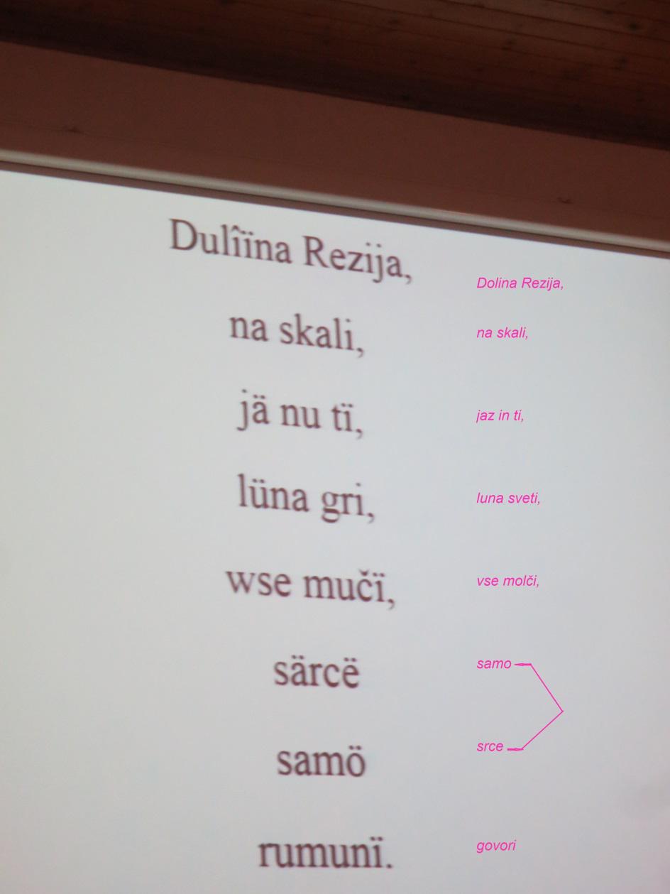 Pot nas je po tako imenovani Železni dolini vodila do odcepa v dolino Rezije (rezijansko Rozajanska dulḯna, italijansko Resia, furlansko Resie, beneško Rèxia), najbolj zahodno naseljeno slovensko pokrajino, na severovzhodu zamejeno s Kaninom (»…ta jora ta čaninova«, pravi rezijanska pesem, kar pomeni »ta gora ta Kaninova«, od canis = pes, saj je gorski hrbet oblikovan kot ležeči pes). Gora na jugu se imenuje Mužca in ima obliko ležečega dekleta. Dolina je odmaknjena, iz Slovenije dostopna skozi Kanalsko dolino, ali pa po strmi poti čez Učjo (volčjo). V Kulturnem domu nas je sprejel domačin Sandro Qualia, ki je kustos muzeja v Solbici in sodelavec Kulturnega doma v Ravanci (Ravanzä, Rozajanska kültürska hiša). V kulturnem domu smo posedli na klopi amfiteatra in poslušali s fotografijami podprto razlago življenja Rezijanov. Rezijanski jezik se je ohranil kot oblika zelo stare slovenščine, ki jo najbolj prepoznamo po nekaterih starih besedah za običaje, ohranja pa jih folklorna skupina, ki deluje že od leta 1838. Tako je v dvorani razstavljena tudi narodna noša in instrumenti.