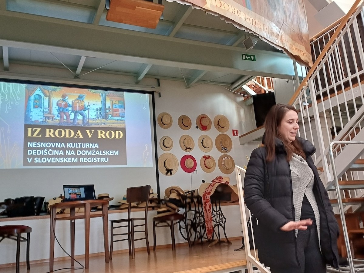 Kustosinja Ana V. Beno je razstavo v Slamnikarskem muzeju pripravila v sodelovanju s Katarino Rus Krušelj in Romanom Kosom. Za našo skupino pa je »ponovila« marsikaj, kar smo že slišale pri naših prejšnjih skupnih urah. Nesnovna dediščina so… »nesnovne dobrine kot prakse, predstavitve, izrazi, znanja, veščine. Povezane so s premičninami in kulturnimi prostori, kjer se ta dediščina predstavlja ali izraža. Skupnosti, skupine, včasih tudi posamezniki, jih prenašajo iz roda v rod in jih nenehno poustvarjajo kot odziv na svoje okolje, naravo in zgodovino.« (Povzeto po ZVKD-1 2008).