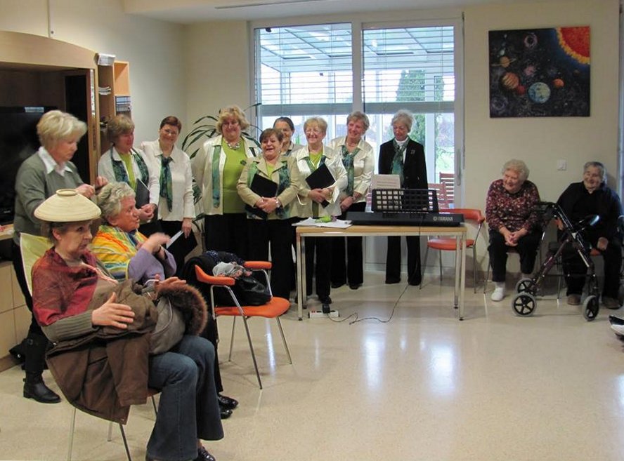 Stanovalci Doma so nas pričakali v večnamenski dvoranici, kjer so že opravili jutranjo telovadbo. da bi prisluhnili našemu programu: