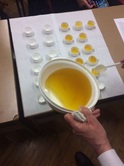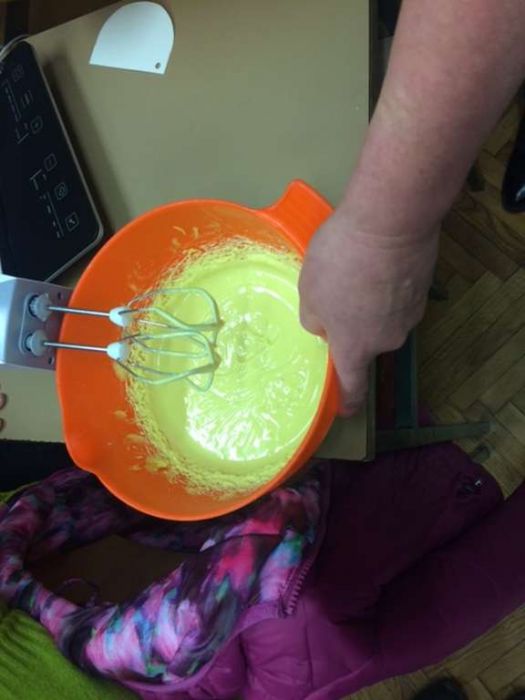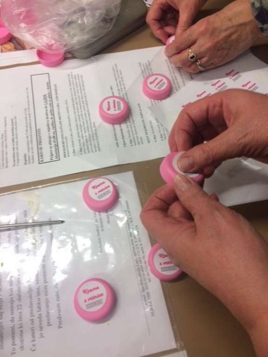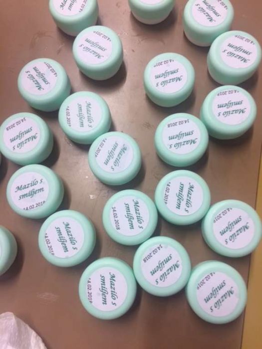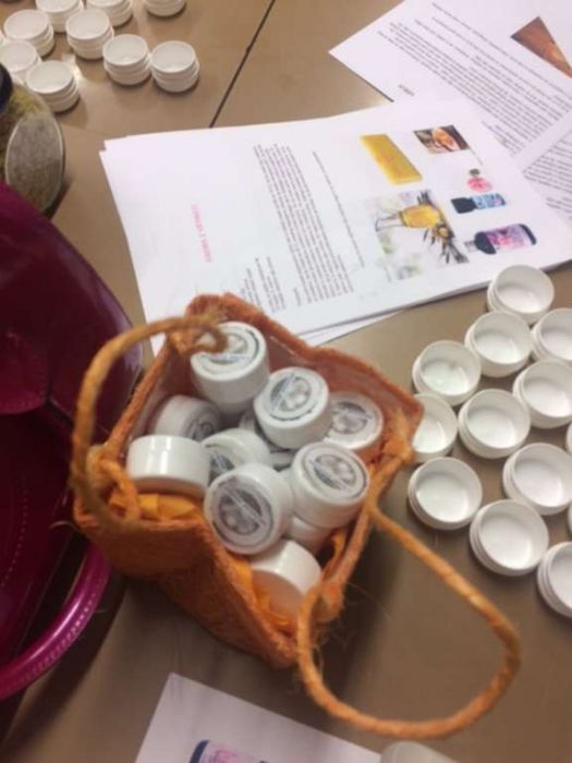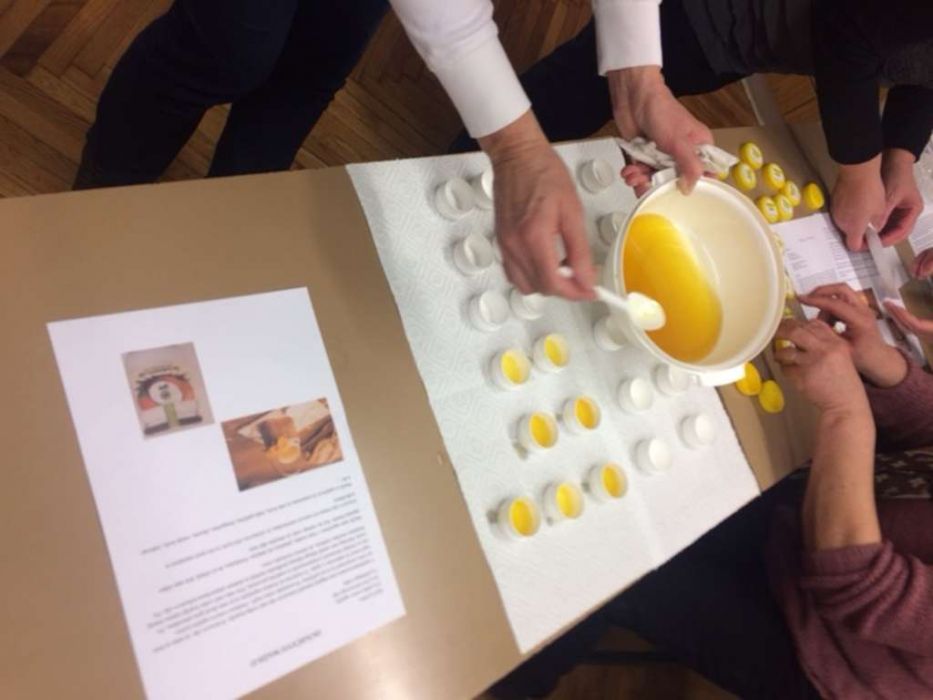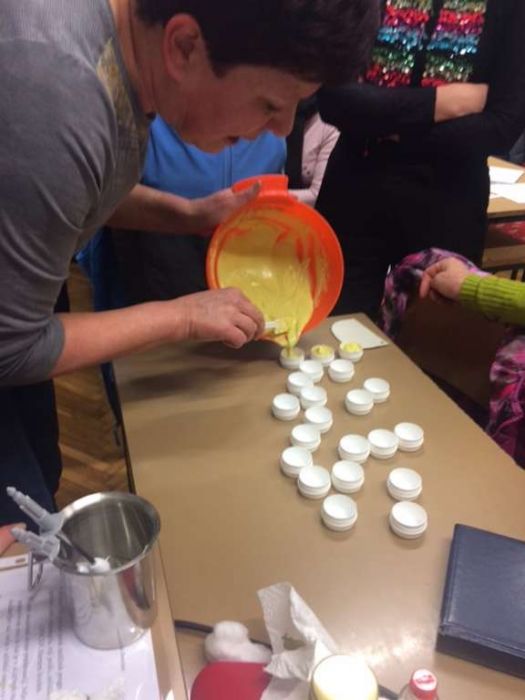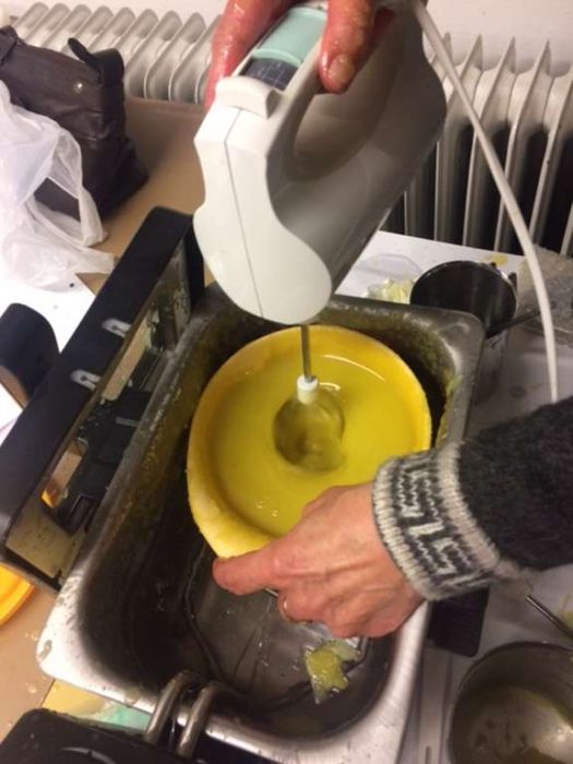 Talile smo maščobo in vosek, mešale sestavine, tudi miksale in končno sestavljeno mazilo izlivale v majhne posodice.