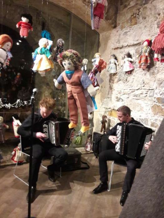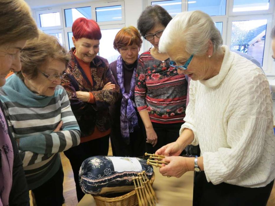 V začetku decembra nam je vsem Ruša naredila adventne venčke: nekateri so bili iz svežega zelenja in okrašeni z rdečimi »jagodami«, nekateri pa iz pozlačenih storžev in drugih naravnih materialov. Na začetku meseca smo se pogovarjale tudi o čipkah in Ruša je prinesla »punkelj«, kleklje in pred nami iz zlate niti ustvarjala čipkasto smrečico.