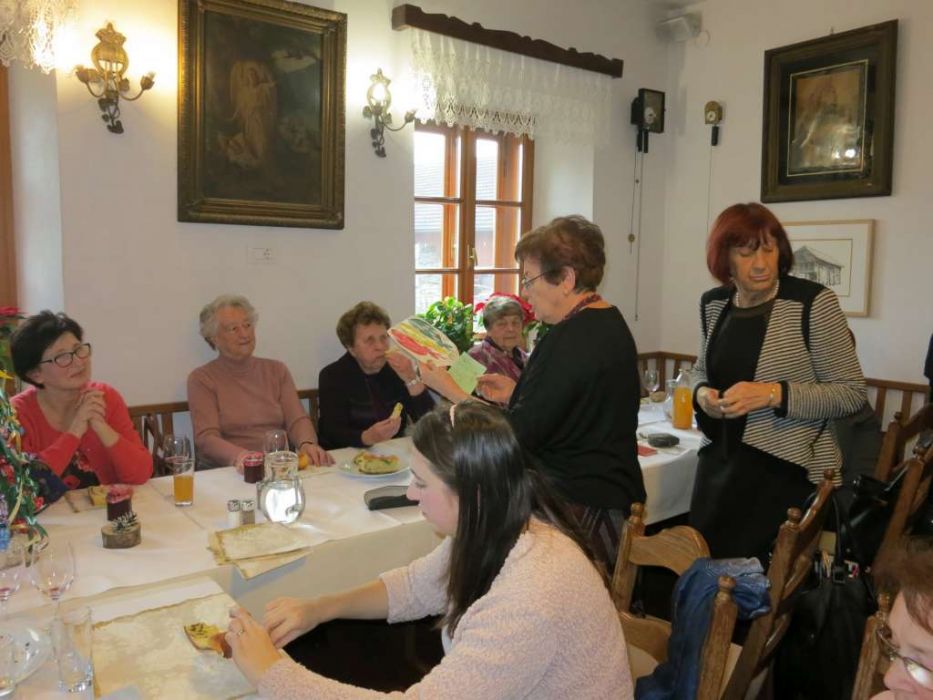 Nadaljevale pa smo s kosilom Pr' Krač, kjer je cela domačija vzor zbiranja in varovanja dediščine. Po domačem in okusno pripravljenem kosilu pa smo zapele nekaj ljudskih pesmi in si razdelile še drobna darila: Andreja nas je obdarovala z doma pripravljeno marmelado, Sanda je ročno izdelala snežene može z voščili, Manica je pripravila fotografije dozdajšnjih naših aktivnosti. Na koncu ni manjkalo ubesedenih voščil in s tem zapisom jih za ltople praznične dni in srečno novo leto predajam tudi vsem vam. Tole je zapisala Sanda: